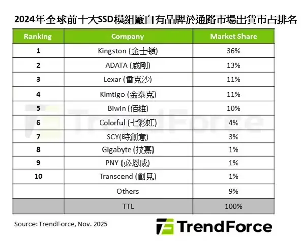 根据该机构统计的模组企业自有品牌固态硬盘通路市场出货数据,2024 年全球前五大固态硬盘模组企业整体市场占有突破八成。传统两强中金士顿以 36% 市占率稳居龙头;威刚则由于高端产品的强势推广和快速导入 PCIe 4.0/5.0 产品,市占升至 13%。