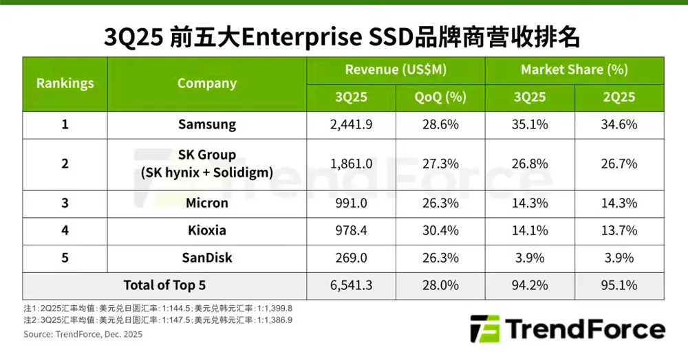 研调机构 TrendForce 集邦咨询今日报道称,TOP5 企业级固态硬盘 (eSSD) 厂商 —— 也是五大 NAND 闪存原厂 —— 今年三季度 eSSD 相关营收总额达到 65.413 亿美元,环比增幅来到 28.0%,创下今年新高。