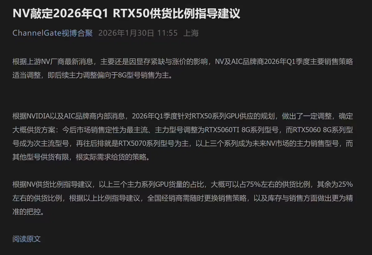 博板堂旗下公众号“ChannelGate 视博合聚”今天发文称,根据上游厂商最新消息,英伟达以及 AIC 品牌商将对今年第一季度的主要销售策略做适当调整,主要偏向于 8GB 显存型号。