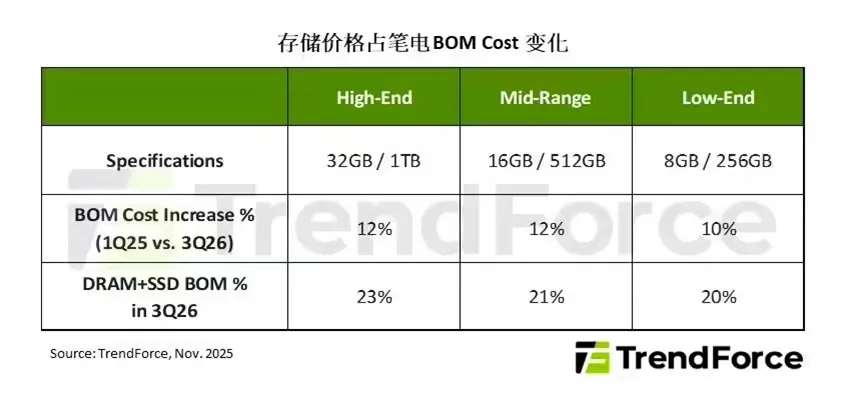 2026 年笔电市场同样将面临明显压力,以今年存储器上涨前的成本结构为基准观察,DRAM 及 NAND Flash 合计占笔电整机 BOM cost 的比重约 10~18%,在如此大幅且连续数季的上涨下,预估存储器占整机 BOM cost 的比重将进一步扩大至 20% 以上。